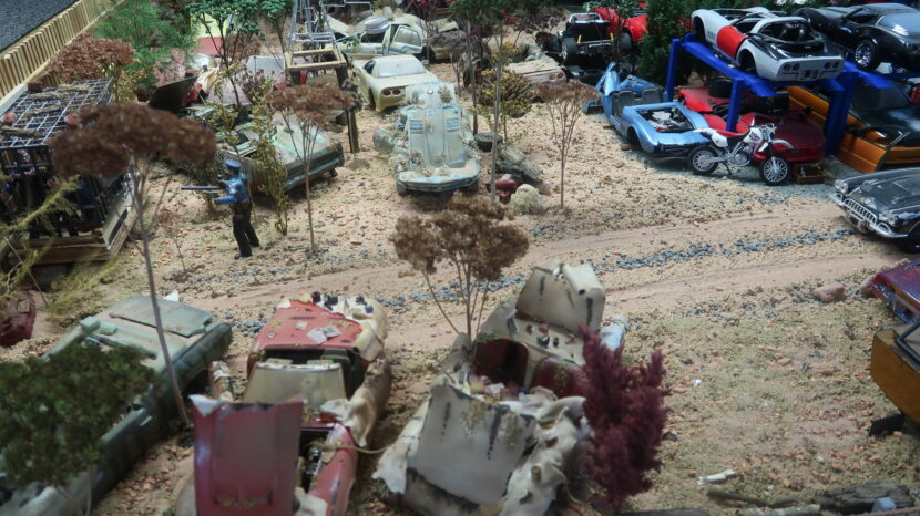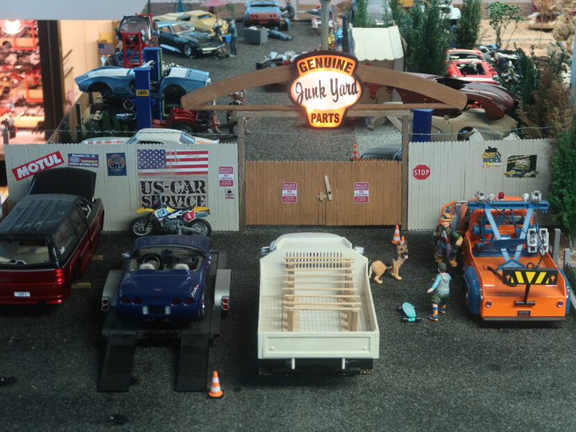 Einfahrtsbereich zum Schrottplatz mit großem Hinweisschild, letzteres wurde vor Ort im 3D-Drucker hergestellt. Mit diesem Hilfsmittel in kleiner Ausführung können viele brauchbare Plastikteile, darunter das komplette Motel. was es so im Handel nicht gibt, in 1 : 18 hergestellt werden.